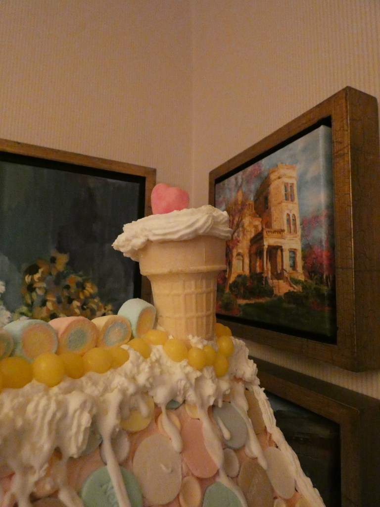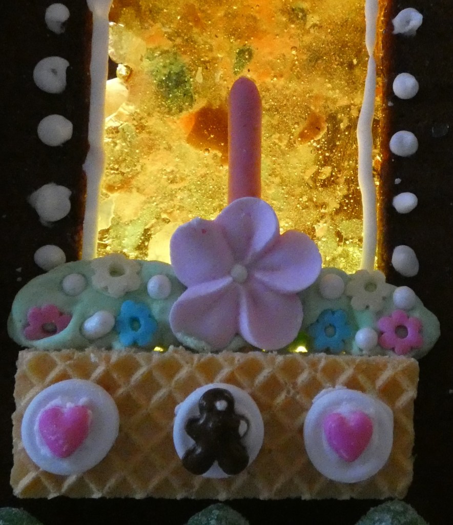The front door is a breakfast biscuit from Dollar Tree which is a generic for Belvita biscuits. It has a dragees doorknob and royal icing wreath. Above the door is a tree sprinkle on a peppermint and a bell made from a yellow gumdrop and a dragees. The garland is green royal icing, sugar pearls, and some large sixlet-like candies from the cake decorating section at Wal-mart.The “Joy” banner is attached to a large pretzel rod. Above the banner are gingerbread man sprinkles on peppermints. A snowflake is on either side of the banner with a dragees in the center.The clock is made from a chocolate-covered graham cracker, topped with a vanilla cookie, topped with a mint candy. Hands were piped from royal icing and are centered with a heart sprinkle.The stained glass windows were made from pouring edible glass windows and then quickly sprinkling chopped lifesavers and jolly ranchers into the hot syrup. Cutting a hole in the back of the house allowed a string of lights to be inserted for a magical glow at night. The best thing about these lights is that they are battery operated, so you don’t have to worry about being near an outlet AND they operate on a timer so only light up for about six hours per day which allows the batteries to last for about 3-4 weeks. Using rechargeable batteries will keep the cost down over time.The window box is a vanilla sugar wafer with smartees and sprinkles glued to the front with royal icing. A strawberry pocky stick forms the candle. The green royal icing is decorated with sprinkles and a large royal icing flower.Windows are topped with half a vanilla cookie, a Haribo cherry heart candy, and dragees. Pirouline wafers are between the windows. The chimney is an ice cream cone filled with royal icing and a Haribo cherry heart candy on top.The chimney is an ice cream cone filled with royal icing and a Haribo cherry heart candy on top.The house features pink swirl lollipops on either corner of the house. The pastel marshmallows line the roof’s edge. Royal icing is highlighted with dragees in many places. Chocolate sugar wafers form the front stairs.